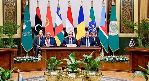 شارك رؤساء دول وحكومات جمهورية إفريقيا الوسطي، وتشاد، وإريتريا، وإثيوبيا، وليبيا، وجنوب السودان، في قمة لدول جوار السودان بالقاهرة اليوم بدعوة من الرئيس المصري عبدالفتاح السيسي، وبحضور رئيس مفوضية الاتحاد الأفريقي وأمين عام جامعة الدول العربية، لبحث كيفية معالجة الأزمة السودانية وتوافق المشاركون في البيان الختامي على ما يلي: