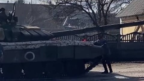 أصرَّ أوكراني على الوقوف أمام دبابة روسية؛ لمحاولة منعها من التقدم شمالي أوكرانيا.