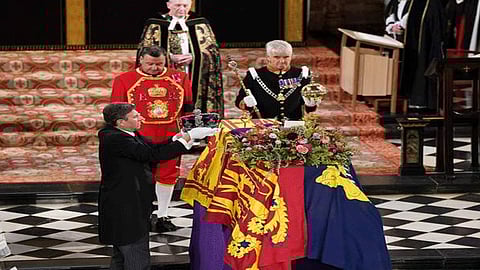 وفي وقت سابق اليوم، أبعد المسؤول عن المجوهرات الملكية التاج والكرة الملكية والصولجان من أعلى التابوت، ليفصل الملكة عن تاجها للمرة الأخيرة.