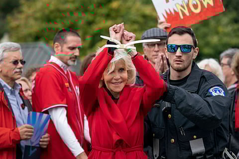 وفوندا واحدة من 16 شخصًا اعتقلوا خلال هذه المظاهرات في واشنطن، وقالت محطة «سي بي إس» الأمريكية إن جميع المعتقلين وجهت لهم اتهامات بإعاقة الطريق والتجمهر.