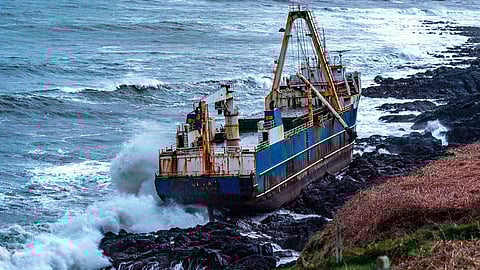 وقذفت العاصفة دينيس، التي ضربت السواحل الأيرلندية مطلع الأسبوع الجاري، السفينة على الشاطئ بالقرب من كورك جنوبي البلاد.