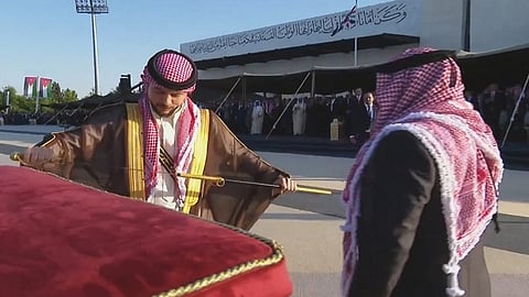 وقال الملك عبدالله الثاني، في كلمة له خلال الحفل العشاء لنجله «بهديك هذا السيف الهاشمي رمز العدل والدفاع عن الوطن».