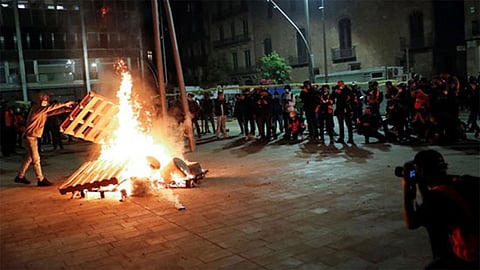 وتصدت شرطة مكافحة الشغب لعشرات المحتجين الذين أضرموا النار في صناديق قمامة بطريق جران بيا الرئيس في مدريد، وفي برشلونة ثاني أكبر مدن إسبانيا، رشق محتجون الشرطة بالحجارة ومقذوفات أخرى في ثاني ليلة من الاضطرابات، بحسب «رويترز».