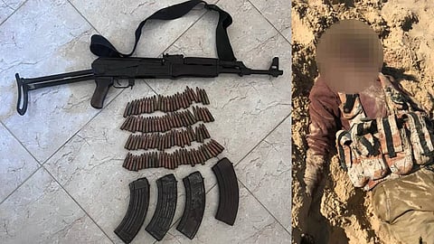 وعثر بحوزة الإرهابي على حزام ناسف، وقنبلتين يدويتين، وسلاح آلي، و4 خزائن، و١١٢ طلقة من ذات العيار.