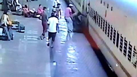 وثق مقطع فيديو لحظة إنقاذ عامل لسيدة من موت محقق أسفل عجلات القطار في محطة سكة حديد «فيرانجانا لاكشميباي» بالهند.