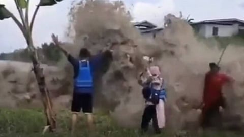 وأظهر مقطع فيديو رجل يرتدي سترة نجاة وهو يسدد لكمات لشجرة موز، بينما تتدحرج موجة على الخلفية من البحر، وآخرون يهرعون راكضين هربا من الموجة لتغمرهم المياه في النهاية.