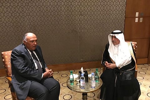 وزير الخارجية الدكتور إبراهيم بن عبدالعزيز العساف، نظيره المصري سامح شكري، اليوم الثلاثاء، على هامش انعقاد اجتماع الدورة العادية لمجلس جامعة الدول العربية على مستوى وزراء الخارجية.