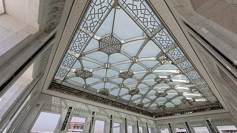 تقع القباب الزجاجية المتحركة أعلى الأفنية الخلفية والوسطية بإجمالي عدد (١٢ وحدة)، بأبعاد القبب (٢٨.٥×١٧ متراً)، وارتفاع خارجي (٨.٧٥ متر)، ووزن حوالي (٣٠٠ طن).