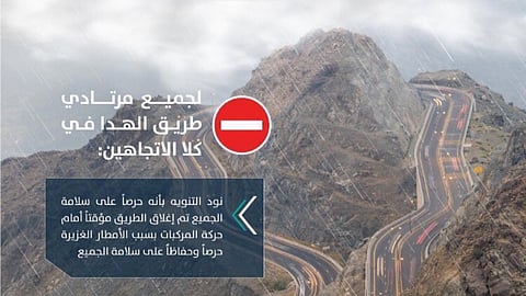 وقال أمن الطرق، في تغريدة عبر "تويتر": "نود التنويه بأنه تم إغلاق طريق الهدا (مؤقتًا) بالاتجاهين بسبب هطول الأمطار ، وذلك حرصاً على سلامة مرتادي الطريق، متمنين السلامة للجميع".