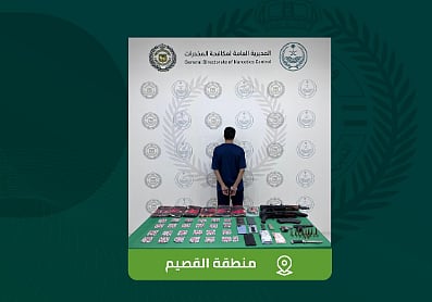 أعلنت المديرية العامة لمكافحة المخدرات، القبض على مواطن بمنطقة القصيم لترويجه (7) كيلوجرامات من مادة الحشيش المخدر وأقراصًا خاضعة لتنظيم التداول الطبي، وضبط بحوزته أسلحة نارية وذخيرة حية.