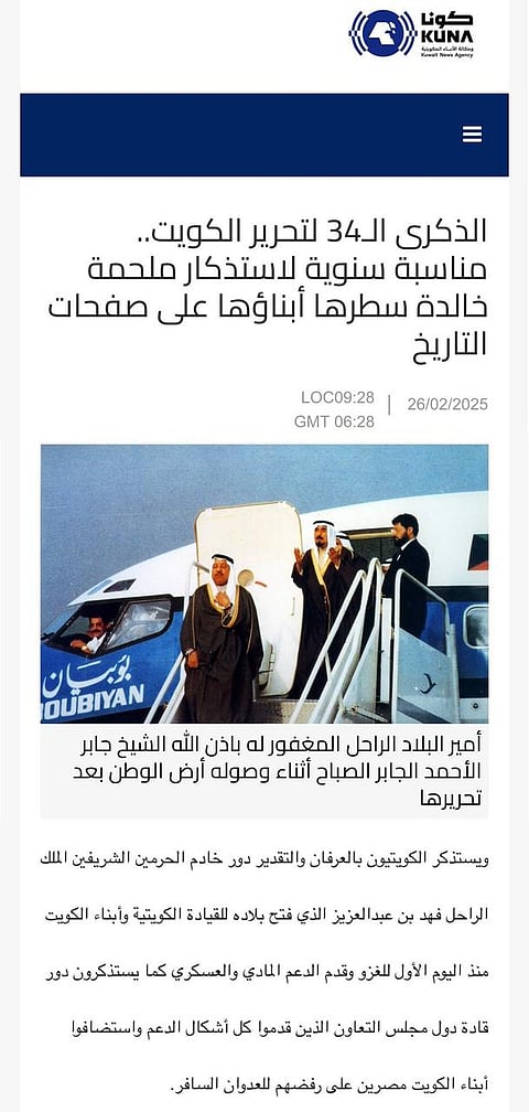 وقالت الوكالة، إنه خلال الذكرى 34 لتحرير الكويت يستذكر الكويتيون بالعرفان والتقدير دور خادم الحرمين الشريفين الملك الراحل فهد بن عبدالعزيز الذي فتح بلاده للقيادة الكويتية وأبناء الكويت منذ اليوم الأول للغزو وقدم الدعم المادي والعسكري.