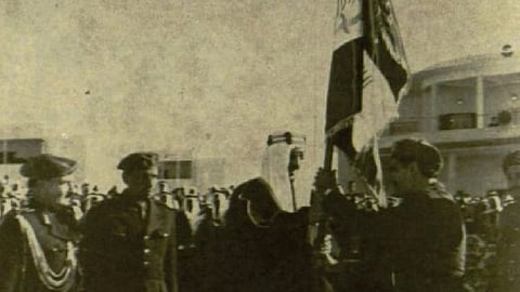 وجاء ذلك عبر الحساب الرسمي للدارة بموقع التواصل الاجتماعي «تويتر»، حيث رفع الراحل الملك سعود بن عبدالعزيز العلم السعودي في كلية الملك عبدالعزيز الحربية بالرياض.