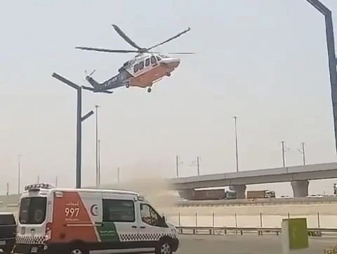 وكان البلاغ قد ورد عند الساعة 11:13 دقيقة من صباح يوم أمس الأربعاء وتبين عند مباشرة الحالة أنها عبارة عن حالة سقوط لأحد العاملين من الدور الثالث، نتج عنها كسور متفرقة، وتم خلالها تقديم الخدمة الإسعافية اللازمة، ونقلت الحالة على الفور إلى مجمع الملك عبدالله الطبي.