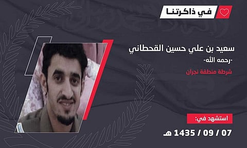 وقال الأمن العام عبر إنفوجرافيك على حسابه بموقع "تويتر"، في ذاكرتنا.. سعيد بن علي حسين القحطاني، الذي استشهد في 7/9/1435.