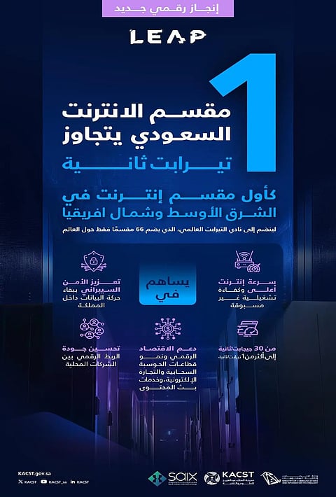 حقق مقسم الإنترنت السعودي "SAIX" بمدينة الملك عبدالعزيز للعلوم والتقنية "كاكست"، إنجازًا لافتًا بوصوله إلى حجم حركة متبادلة بين الأعضاء المرتبطين تجاوزت 1 تيرابت / ثانية، وبكفاءة تشغيلية عالية وأداء موثوق، ليتبوأ صدارة مقاسم إنترنت المنطقة والوحيد منها ضمن أعضاء نادي التيرابتالمكون من 66 مقسمًا للإنترنت فقط على مستوى العالم.