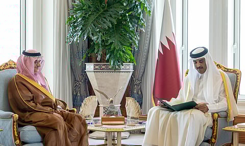 وقالت وكالة الأنباء القطرية، إن الأمير منصور بن خالد بن فرحان آل سعود سفير المملكة العربية السعودية لدى دولة قطر، سلم الرسالة إلى الشيخ تميم، خلال استقبال الأمير له بمكتبه في الديوان الأميري صباح اليوم.