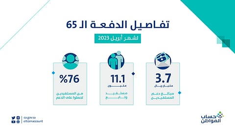 وبدأ «حساب المواطن» في إيداع مستحقات المستفيدين المستوفين للشروط ضمن الدفعة الـ65، دفعة شهر أبريل.