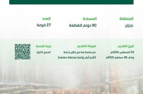وأوضحت الوزارة أن الفرصة متاحة لقطاع الأعمال والأفراد والجمعيات التطوعية، عن طريق التقديم على قطع الأراضي الزراعية المطروحة للتأجير من خلال المخططات الزراعية المعتمدة في منطقة نجران، وذلك بعد استيفاء الشروط وتقديم المستندات المطلوبة، ورفع الطلب عبر رابط المنصة: (naama.sa)، مشيرةً إلى أن التقديم على الفرص يبدأ من تاريخ 29 أغسطس وحتى 28 سبتمبر 2024م.