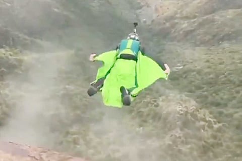 مارس أسرع رجل في العالم في الطيران بالبدلة المجنحة كريس بيرنز، هوايته في المغامرة من فوق جبال السودة بمنطقة عسير.
