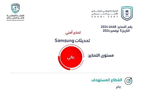 أصدر المركز الوطني الإرشادي للأمن السيبراني تحذيرًا أمنيًا يدعو فيه المستخدمين إلى المبادرة بإجراء التحديثات الأمنية على منتجات سامسونج Samsung.