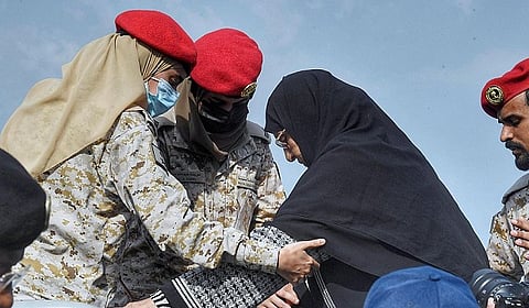 عبّرت سيدة مسنة عن سعادتها البالغة بالوصول إلى المملكة، فور نزولها من على متن سفينة جلالة الملك "الجبيل" بقاعدة الملك فيصل البحرية في جدة.