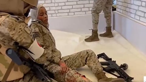 جاء ذلك ضمن فعاليات مؤتمر المحاكاة الصحية الذي أقيم في الرياض، فيما وثق مقطع الفيديو، مجندات داخل نموذج محاكاة للمعركة، تقوم إحداهن بإجراء إسعافات أولية للمصابة، فيما يحرسها وزميلتها الأخريات.
