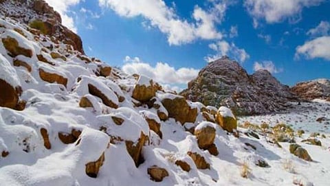 ويشهد جبل اللوز في منطقة تبوك شمال المملكة استمرار تساقط الثلوج، مع انخفاض درجات الحرارة إلى 0 درجة مئوية.