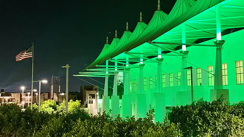 احتفت قنصلية الولايات المتحدة الأمريكية في جدة، باليوم الوطني السعودي الـ92، بإضاءة المبنى باللون الأخضر.