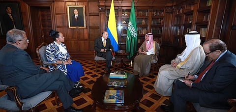 حضر اللقاء، سفير خادم الحرمين الشريفين غير مقيم لدى جمهورية كولومبيا الدكتور حسن الأنصاري، ومدير عام مكتب وزير الدولة للشؤون الخارجية عضو مجلس الوزراء ومبعوث شؤون المناخ السفير خالد بن مساعد العنقري.