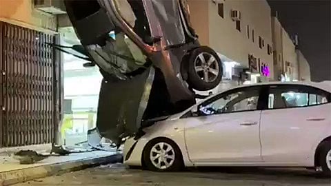 وأظهر الفيديو وقوف إحدَى السيارات بشكلٍ رأسي على سيارة تقف على جانب الطريق، دون تداول كيف وقع ذلك الحادث وأسبابه، لكن ما بدا في الفيديو هو تهشُّم السيارة المقلوبة على رأسها بشكل كبير، ولم يتم معرفة أية تفاصيل أخرى عن الحادث.