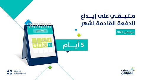 أعلن برنامج حساب المواطن، اليوم الثلاثاء، موعد صرف دعم شهر ديسمبر (الدفعة الـ 61) للمستفيدين المكتملة طلباتهم.