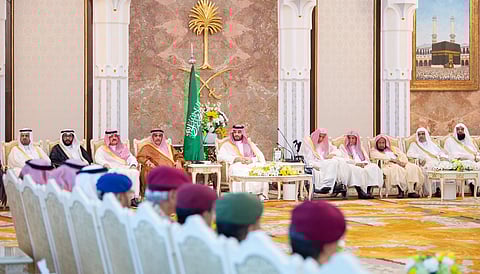 نيابة عن خادم الحرمين الشريفين الملك سلمان بن عبدالعزيز آل سعود القائد الأعلى لكافة القوات العسكرية ـ حفظه الله ـ، استقبل صاحب السمو الملكي الأمير محمد بن سلمان بن عبدالعزيز آل سعود ولي العهد رئيس مجلس الوزراء، في الديوان الملكي بقصر منى، اليوم، أصحاب السمو الملكي الأمراء، وسماحة مفتي عام المملكة، وأصحاب الفضيلة العلماء والمشايخ، وكبار المدعوين من دول مجلس التعاون لدول الخليج العربية، وأصحاب المعالي الوزراء، وقادة القطاعات العسكرية المشاركة في حج هذا العام، وقادة الأسرة الكشفية في المملكة المشاركة في الحج.