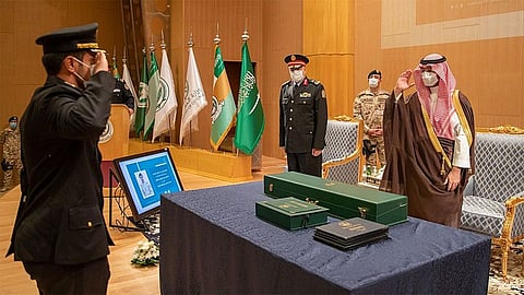وكان في استقباله لدى وصوله مقرّ الحفل المدير العام التنفيذي للشؤون الصحية الدكتور بندر بن عبدالمحسن القناوي، ورئيس الجهاز العسكري المكلف اللواء الركن منصور العيسى، واللواء الركن نايف بن ماجد رئيس هيئة التعليم والتدريب، وقائد كلية الملك عبدالله بن عبدالعزيز للقيادة والأركان المكلف اللواء الركن محمد الدوسري.