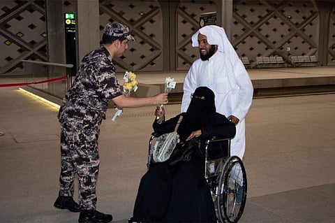 وزعت قوة أمن المنشآت بالمدينة المنورة، أمس الخميس، الورود والهدايا على طلائع الحجاج القادمين إلى المدينة المنورة عبر قطار الحرمين السريع، بعد أن من الله عليهم بأداء الفريضة.