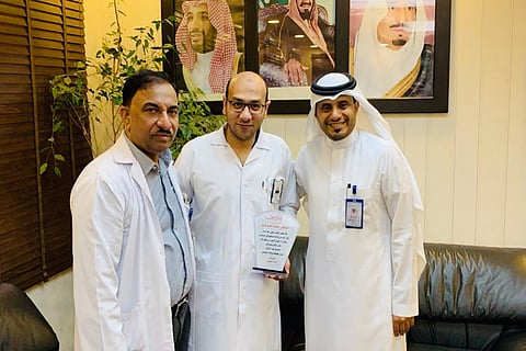 وقدَّم المواطن المحيسن، وبحضور مدير المستشفى الأخصائي أول موسى الهزازي، درعًا تكريميًا للطبيب محمد ثابت؛ وذلك عرفانًا منه على ما قدَّمه الطبيب المعالج من إخلاص ومتابعة وأداء متميز، مبديًا امتنانه للطبيب «ثابت» على اهتمامه ودوره الطبي.