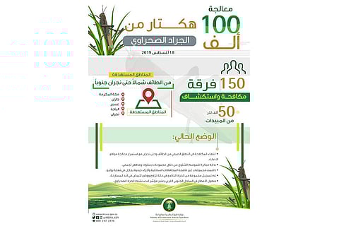 وأوضحت الوزارة، خلال إنفوجراف نشرته عبر حسابها الرسمي على موقع «تويتر»، أن عمليات مكافحة الجراد تمت من خلال 150 ألف فرقة مكافحة واستكشاف، وذلك باستخدام 50 ألف لتر من المبيدات؛ حيث شملت المناطق المستهدفة، من الطائف شمالًا حتى نجران جنوبًا كلًّا من «مكة المكرمة، وجازان، وعسير، والباحة، ونجران».