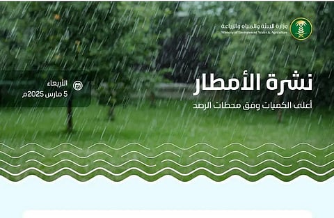 ووفقًا للتقرير اليومي لوزارة البيئة والمياه والزراعة، حول كميات هطول الأمطار في مناطق المملكة كافة؛ سجّلت (81) محطة رصد هيدرولوجي ومناخي، خلال الفترة من الساعة التاسعة صباح الثلاثاء 4 مارس وحتى التاسعة صباح الأربعاء 5 مارس 2025م، هطول أمطارٍ في مناطق (الرياض، ومكة المكرمة، والمدينة المنورة، والقصيم، والشرقية، وحائل، والحدود الشمالية، والباحة).