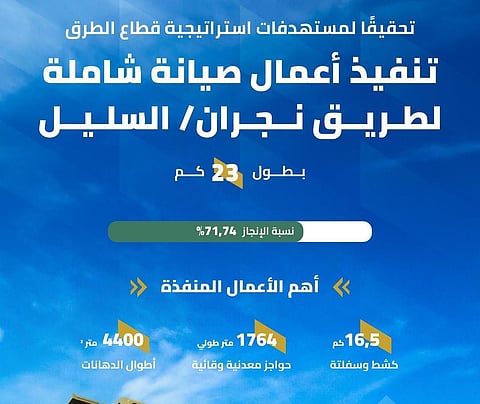 أعلنت الهيئة العامة للطرق، ارتفاع نسبة الإنجاز في مشروع صيانة طريق «نجران/ السليل» بطول 23 كم، الذي يربط بين منطقتي نجران والرياض، يأتي ذلك ضمن استراتيجية قطاع الطرق التي تستهدف ترسيخ مكانة المملكة كمركز لوجستي عالمي، والارتقاء بجودة الحياة عبر توفير طرق ذات موثوقية ومستوىً عالٍ من السلامة والجودة.