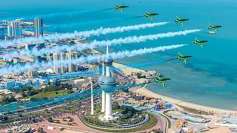 نفّذت طائرات فريق الصقور السعودية تشكيلات جوية رائعة في سماء دولة الكويت، وذلك ضمن مشاركتها في فعاليات الاحتفال باليوم الوطني الكويتي الـ62.
