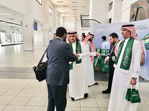حيث تم استقبال المسافرين القادمين عبر الرحلات الداخلية من مختلف المناطق، بالورود ورايات الوطن، إضافة إلى الأهازيج التي شاركت بها الفرق الشعبية احتفالًا بالمناسبة الوطنية المجيدة.