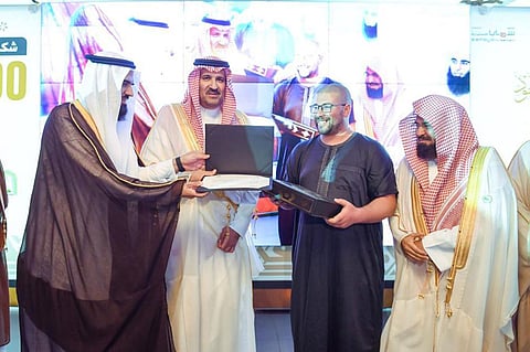 كرم الأمير فيصل بن سلمان بن عبدالعزيز، أمير منطقة المدينة المنورة، اليوم الأحد، الزائر رقم خمسة مليون لمتحف معرض القرآن الكريم في المدينة المنورة؛ حيث تسلم الزائر مصحف من إصدارات مجمع الملك فهد لطباعة المصحف الشريف.