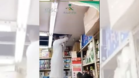 ونشر الحساب الرسمي لـ«صحة الرياض» مقطع فیديو أظهر قیام المفتشین باستخراج كمیات السجائر والمعسل التي أخفاها صاحب المحل فوق السقف إضافي.