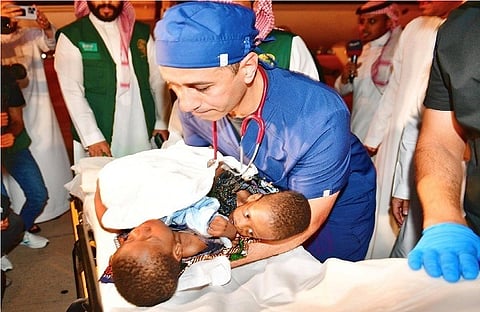 وأوضح رئيس الفريق الطبي والجراحي الدكتور عبدالله الربيعة -في تصريح صحفي-، أن التوأم قدما من مدينة دار السلام في جمهورية تنزانيا عبر طائرة الإخلاء الطبي لمدينة الرياض يوم 7 صفر 1445هـ الموافق 23 أغسطس 2023م، مشيرًا إلى أنه تم إجراء فحوصات طبية متعددة وعقدت اجتماعات من قبل الفريق الطبي المختص، وأظهرت الفحوصات أن التوأم يشتركان في منطقة أسفل الصدر والبطن والحوض ولكل منهما طرف سفلي واحد ويشتركان في طرف سفلي ثالث ومشوه، كما يلتصقان في الكبد والأمعاء والجهاز البولي وعضو تناسلي ذكري واحد وتشوّه بجدار البطن السفلي والمثانة البولية.