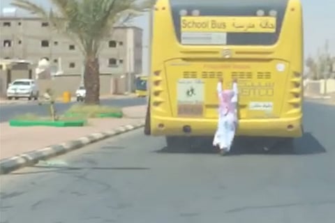 وأظهر الفيديو الذي صوره أحد المواطنين أحد الطلاب وهو متعلق بحافلة مدرسية كانت تسير داخل أحياء مركز بئر بن هرماس الواقع على بعد 50 كيلومترًا من مدينة تبوك