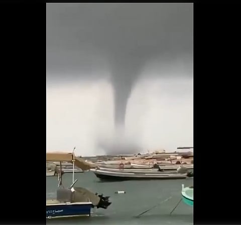 وتداول مستخدمو مواقع التواصل الاجتماعي مقطع فيديو لتشكل الشاهقة المائية على سواحل منطقة رابغ.