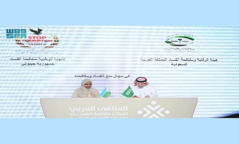 وقعت المملكة ممثلة في هيئة الرقابة ومكافحة الفساد واللجنة الوطنية لمكافحة الفساد في جمهورية جيبوتي، اليوم، مذكرة تفاهم في مجال مكافحة الفساد وتعزيز التعاون المشترك، وذلك على هامش أعمال الملتقى العربي لهيئات مكافحة الفساد ووحدات التحريات المالية، الذي يحظى برعاية سمو ولي العهد - حفظه الله - المقام في مدينة الرياض.