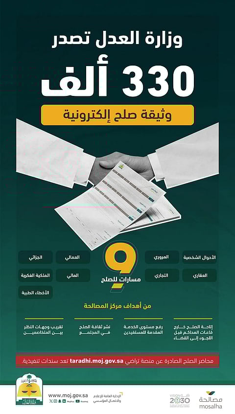 أصدر مركز المصالحة في وزارة العدل أكثر من 330 ألفًا من وثائق الصلح الإلكترونية، في 9 مسارات تتمثل في الأحوال الشخصية، والمروري، والعقاري، والجزائي، والتجاري، والعمالي، والمالي، والملكية الفكرية، وأخيراً مسار الأخطاء الطبية.