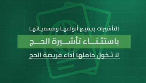 أكدت وزارة الداخلية، أن تأشيرات الزيارة بجميع أنواعها ومسمياتها، باستثناء "تأشيرة الحج" لا تخوّل حاملها أداء فريضة الحج.