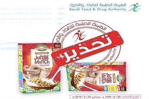 وأوضحت الهيئة أن المنتج الأول يحمل اسم «Choco Chimps» ووزن 10 أونصات (284 جرامًا) ورقم «باركود» 058449870241، وتاريخ انتهاء صلاحيته 2019/08/27م، أما المنتج الثاني فيحمل «Gorilla Munch» ووزن 10 أونصات (284 جرامًا) ورقم باركود 058449860020، وتاريخي انتهاء صلاحية 2019/09/21م و2019/08/24م، في حين أن المنتج الثالث يحمل «Jungle Munch».