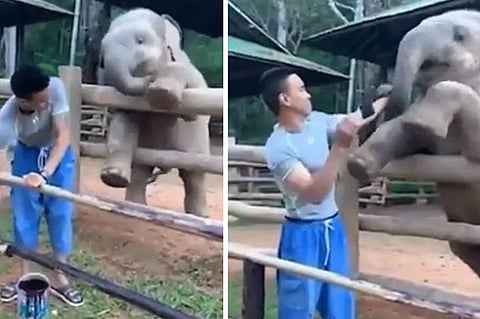 وتابع القول بأنَّ الشابّ واصل عمله وأخذ يدهن السياج؛ إلَّا أنَّ ذلك لم يُثني الفيل الصغير عن مُحاولته؛ ليستسلم له العامل في نهاية المطاف، ولم يُشر من قام بنشر هذا الفيديو على موقع التواصل الاجتماعي "تويتر" إلى مصدر حصوله على هذا المقطع الظريف.